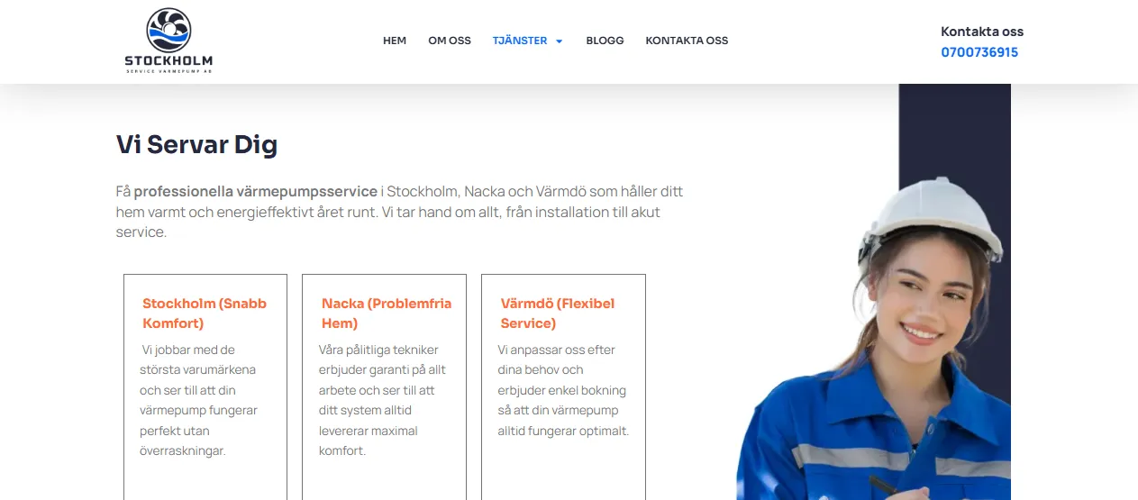 The project aimed to position Service Värmepump as the most reliable, fast-acting authority for heat pump troubleshooting and repairs. We focused on creating an intuitive, action-oriented design that immediately addresses common customer pain points—such as strange odors, system leaks, power trips, and frost build-up. Strategic SEO efforts targeted high-intent, urgency-driven keywords like “Akut värmepumpsservice Stockholm,” “Service av luftvärmepump Nacka,” and “Trasig värmepump Värmdö” to capture users exactly when they need immediate assistance.